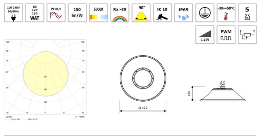 Kształt dolnej części korpusu i pierścieniowy układ optyczny kształtujący strumień światła pozwolił uzyskać szczególnie niski współczynnik olśnienia. Wysoką sprawność uzyskano dzięki odpowiedniej konstrukcji stałoprądowego zasilacza. Oprawa umożliwia sterowanie mocą strumienia świetlnego w standardzie 1-10V, PWM lub rezystancyjnie. Montaż przez zawieszenie.