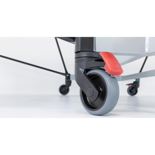 - 4 skrętne koła o średnicy 100 mm z bieżnikiem gumowym na każdym blacie, 2 z blokadą
