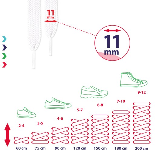 Nasze sznurowadła mają 11 mm grubości. Pasują do wszystkich popularnych butów. Zmierz swoje stare sznurówki i dopasuj odpowiednią długość. Lub skorzystaj ze zdjęcia obok.