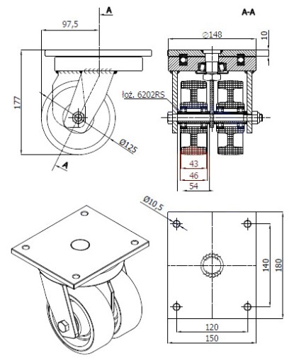 - Obudowa skrętna z mocowaniem płytkowym wykonana jest ze stalowych elementów spawanych, koło osadzone jest na tulejce, montowane jest z kielichem obudowy za pomocą śrubki i nakrętki. Obudowa łożyskowana jest podwójnym rzędem kulek w głowicy skrętnej.. Uszczelniacz tworzywowy zabezpiecza kulki łożyska wypełnione długotrwałym smarem. Płytka mocująca obudowy koła zapewnia solidny i bezpieczny montaż.