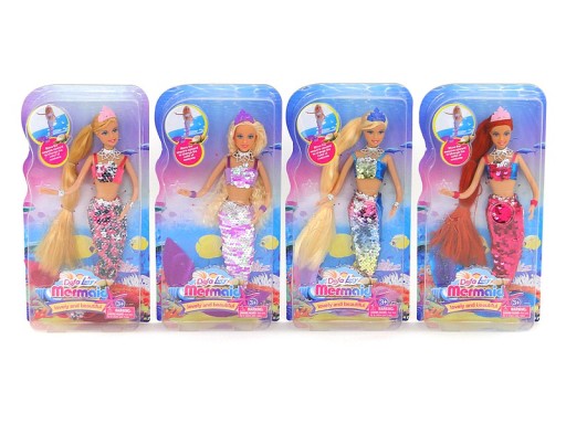 Lalka syrenka o wielkości 29 cm. Ubrana jest w strój kąpielowy. Posiada również ogon ozdobione mieniącymi się cekinami. Wymiary opakowania: 33 x 17 x 5 cm Występuje w 2 wariantach (sprzedawane oddzielnie) Wiek: 3+
