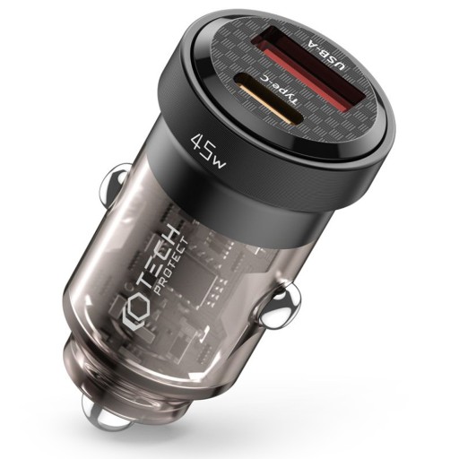Tech-Protect CC45W to dwuportowa ładowarka samochodowa wyposażona w gniazda o łącznej mocy 45W. Jeden z portów to typowy USB-A w standardzie szybkiego ładowania QuickCharge 3.0, drugi natomiast to USB Type-C z zaimplementowaną technologią PowerDelivery.