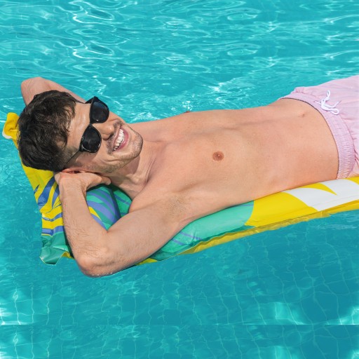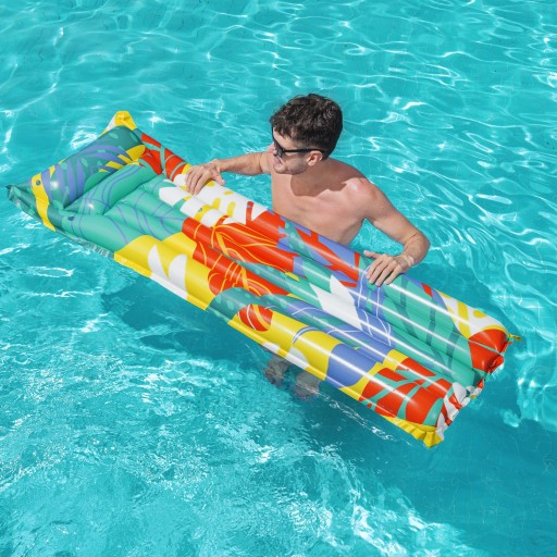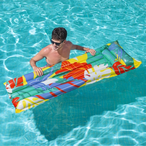 Materac do pływania firmy Bestway w żywych tropikalnych kolorach to idealne rozwiązanie na letni wypoczynek nad morzem, jeziorem w basenie czy we własnym ogrodzie. Dmuchany materac wykonany jest z wytrzymałego materiału PCV, który posłuży przez kilka lat. Charakterystyczną cechą nadmuchiwanego materaca dwukomorowy zagłówek , zapewniający dodatkowy komfort i wygodnie oparcie dla głowy. Materac do pływania to wspaniała propozycja dla osób ceniących wygodę i relaks na świeżym powietrzu.