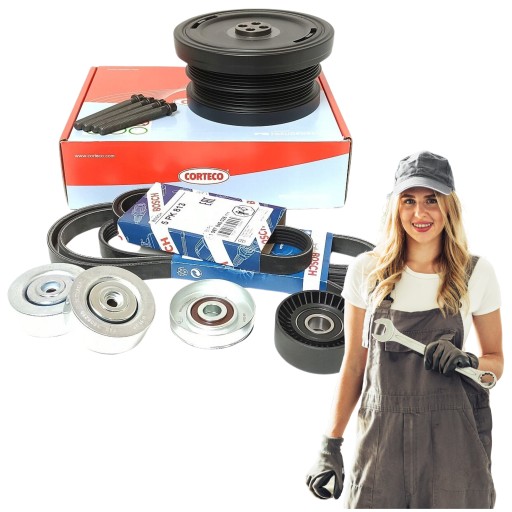 Nowe koło pasowe wału, rolki napinaczy, prowadzące, główny pasek osprzętu oraz pasek kompresora klimatyzacji - cena za komplet.