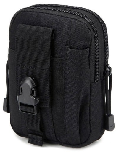 Niezwykle użyteczna saszetka taktyczna w kolorze czarnym z miejscem na telefon komórkowy.