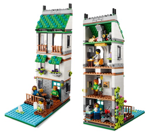 Dzieci mogą wybrać jeden z trzech różnych domów, jakie oferuje ten zestaw. Mogą zbudować dwupiętrowy dom rodzinny z tarasem w ogrodzie, a potem zmienić go w trzypiętrową kamienicę nad kanałem z gabinetem na poddaszu, galerią sztuki i kawiarnią lub wybrać się na urlop w domku nad jeziorem z łódką. Każdy model można dostosować do siebie i bawić się z obu stron. Dysponują one trzema minifigurkami (dwoje dorosłych i dziecko), którym można zmieniać ubrania i fryzury, by tworzyć różne postacie.
