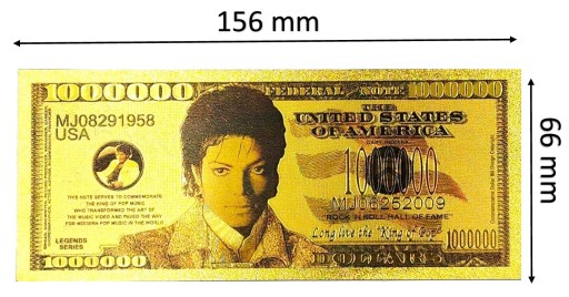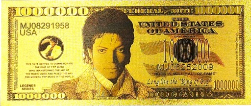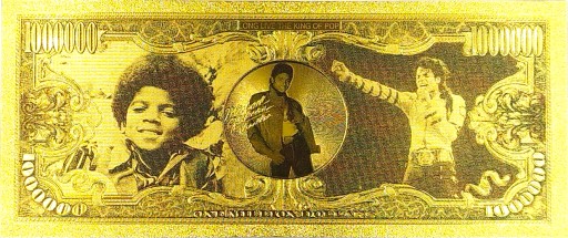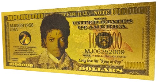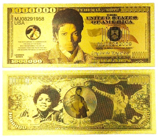 Fantazyjny banknot z wizerunkiem niekwestionowanego "króla popu" - Michaela Jacksona. Zaliczany jest on do najwybitniejszych artystów w historii muzyki. Jest najlepiej sprzedającym się wykonawcą solowym wszechczasów oraz najczęściej nagradzanym.