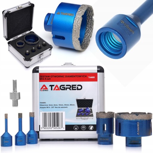 Zestaw 5 otwornic, koronek diamentowych do ceramiki, kamienia, gresu, glazury 6, 8, 10, 35 oraz 68 MM M14, aluminiowa walizeczka, adapter M14/3/8'' HEX