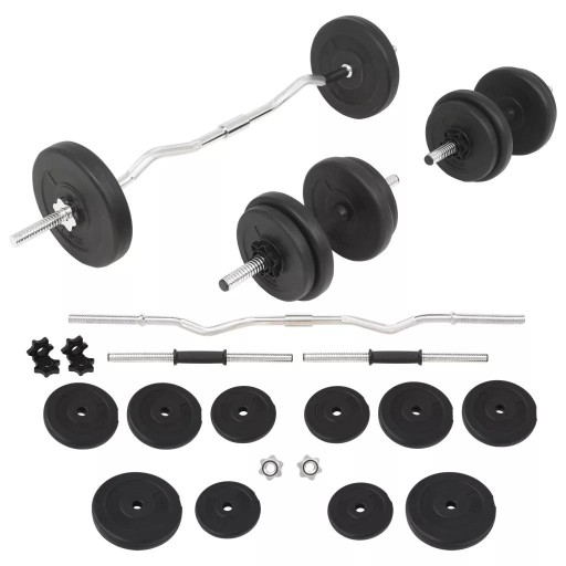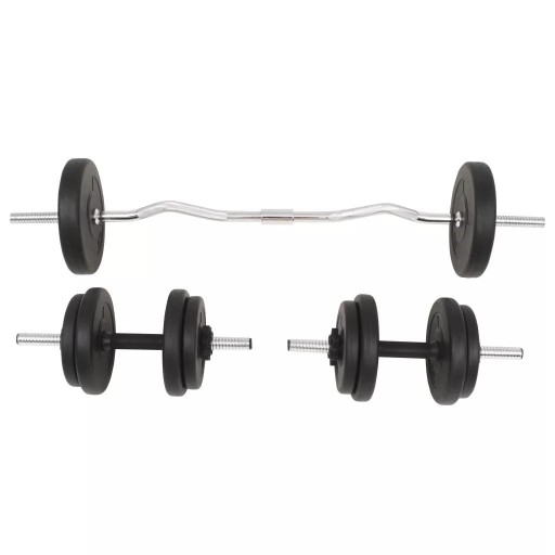 Wszechstronny zestaw sztangi i hantli jest idealny do ćwiczeń klatki piersiowej, bicepsów, ramion, tricepsów i mięśni pleców. Obejmuje dwa obciążenia o wadze 5 kg, cztery o wadze 2 kg, cztery o wadze 1,25 kg, jeden gryf sztangi i dwa gryfy hantli o łącznej wadze około 30 kg.