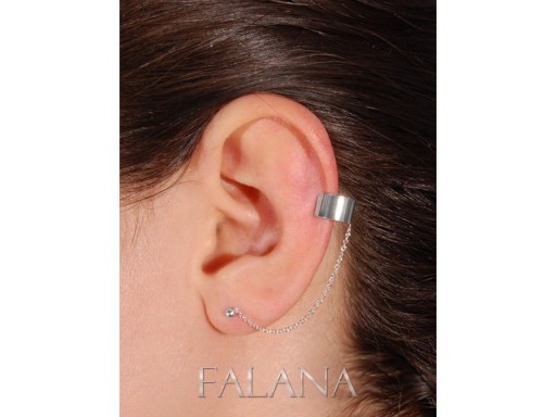 Srebrny kolczyk złożony z łańcuszka i blaszki zakładanej na górną część ucha. Próba srebra 925.