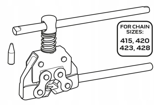 Z jego pomocą łatwo przetniesz łańcuch do odpowiedniej długości bez potrzeby użycia innych narzędzi. Rekomendowany do użycia z łańcuchami o rozmiarze: 415, 420, 423, 428. Będzie niezbędny w profesjonalnych serwisach oraz warsztatach motoryzacyjnych. Przyda się również majsterkowiczom oraz fanom majsterkowania.