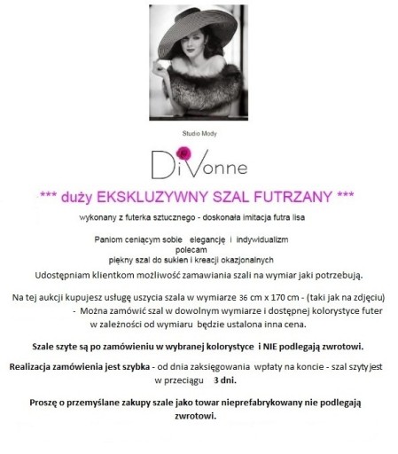 Na tej aukcji kupujesz szal w wymiarze: 36 cm x 170 cm w cenie 185 zł wraz z usługą szycia, nie podlega zwrotowi.