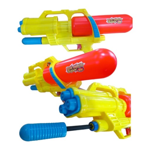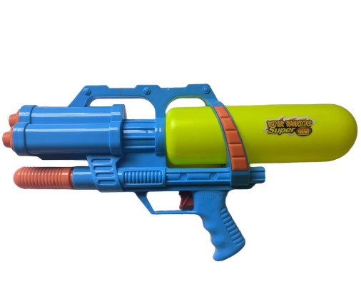 - Pistolet posiada zbiorniczek na wodę oraz pompkę - wystarczy nalać wodę do pistoletu i za pomocą uchwytu pompki strzelając z wyrzutni strumienia wody.