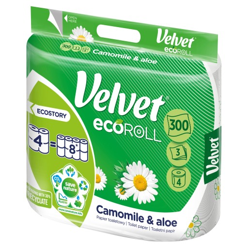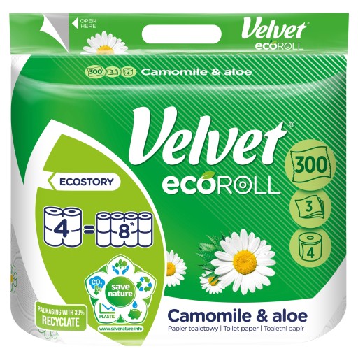 Papier toaletowy Velvet ecoRoll o zapachu rumianku i aloesu. Trzysta trzywarstwowych listków na jednej rolce: 4=8 rolek. Trzy warstwy miękkiej bibułki z eleganckim tłoczeniem i nadrukiem.