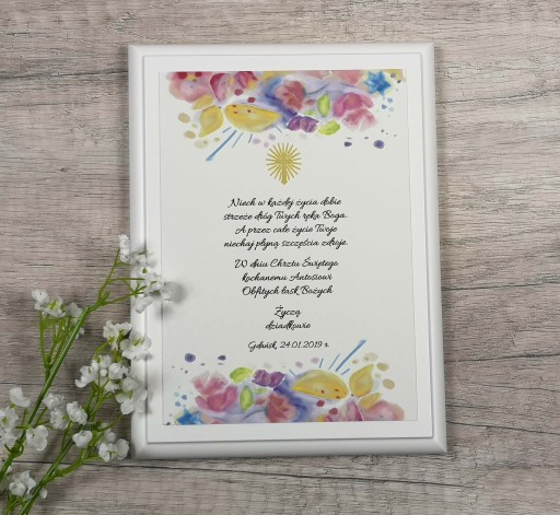 Wysoka jakość wydruku i wykonania, biały podkład pasujący na tę okazję, tworzą miłą pamiątkę tego uroczystego dnia.