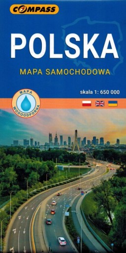Składana, dwustronna, laminowana mapa samochodowa Polski w skali 1:650 000 wydawnictwa Compass.