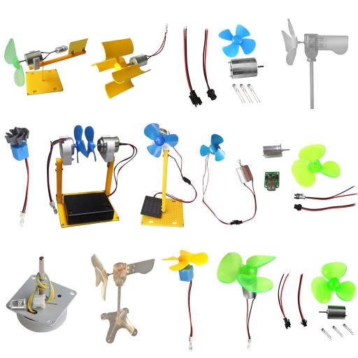 Kompletny zestaw modeli mini generatorów wiatrowych.