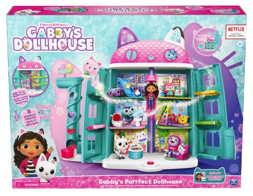 Gabby's Purrfect Dollhouse to wyjątkowy domek dla laleczki Gabi i jej kotków. Ma 60 cm wysokości, składa się z kolorowych tematycznych pomieszczeń. Domek otwiera się i zamyka. Ma duże dwuskrzydłowe drzwi, na których można umieścić dodatkowe pomieszczenia tematyczne (kupowane oddzielnie) W domku znajduje się też winda i zjeżdżalnia. Domek posiada efekty świetlne i dźwiękowe, usłyszymy też głosy znane z filmu.