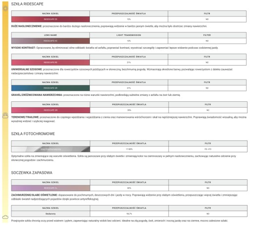 - Soczewki o wysokim kontraście RIDESCAPE HC blokują silne refleksy świetlne, pozwalając dostrzec więcej szczegółów otoczenia podczas codziennej jazdy.