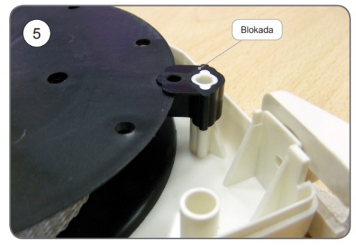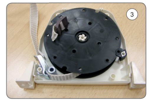 5. Następnie zwalniamy blokadę przytrzymując szpulę ręką (5) pasek zostanie samoczynnie zwinięty.