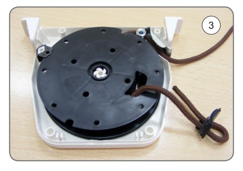 4. Zostawiając minimalną wymaganą długość linki, wsuwamy element mocujący wraz z linką do szpuli (4)