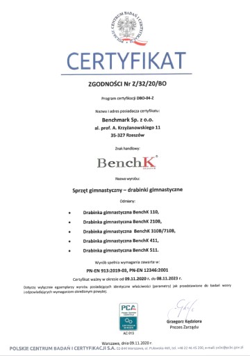 Meble sportowe BenchK zostały wyprodukowane w Polsce zgodnie z ogólnoeuropejskimi normami bezpieczeństwa PN-EN 12346:2001, PN-EN 913:2019-03, co oznacza, że mogą być wykorzystywane w szkołach, przedszkolach, siłowniach oraz przez klientów indywidualnych, którzy otrzymują pewność, że produkt zamontowany w ich domach jest bezpieczny.