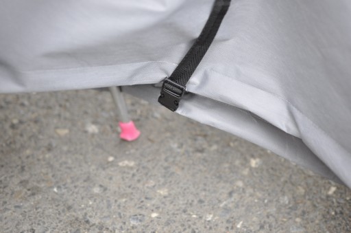 - Wszyty sznurek w dolnej części plandeki po całym obwodzie przy odpowiednim naciągnięciu zabezpiecza przed zerwaniem się pokrowca w wietrzne dni, w środkowej części dodatkowo taśma z klamrą
