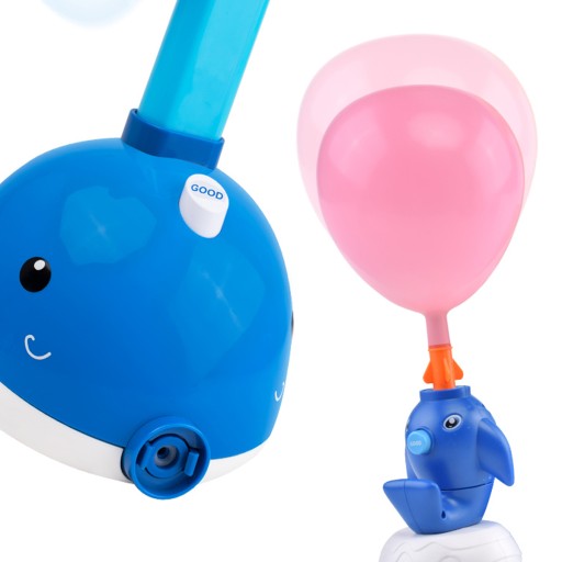 ⭐ Wyrzutnia balonów działa w taki sposób, że do dużego delfina wpina się samochodzik z umieszczonym balonem, a następnie należy pompować balonik tak długo, aż autko zostanie wprawione w ruch.