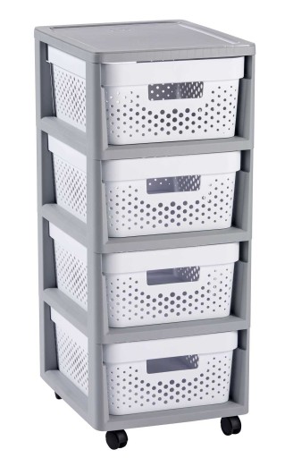 Na tej aukcji kupują Państwo: Regał z czterema koszami ażurowymi 11l w kolorze szarym/białym. Poniższa aranżacja może prezentować inne wersje kolorystyczne i produkty marki Curver dostępne dostępne na naszych pozostałych aukcjach allegro.