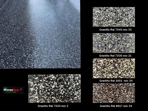 Zdjęcie przedstawia zestawienie i efekt końcowy porównujący "Micronfloor Kamienny dywan" w górnej części zdjęcia z żywicą "Micronfloor Granitto" w dolnej.