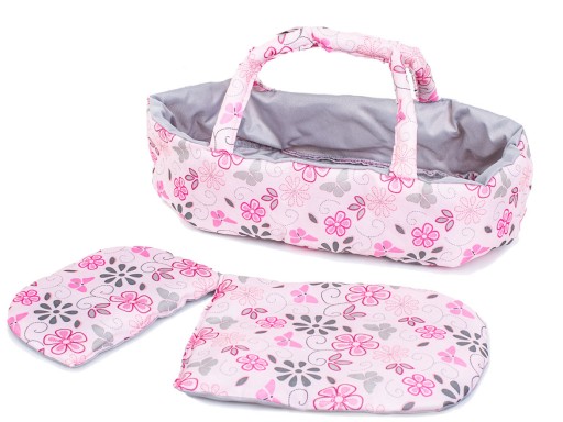 W zestawie znajdują się dodatkowe akcesoria dopasowane kolorystycznie do całości: nosidełko z wygodnymi uchwytami (pełniące rolę gondoli) oraz pościel.