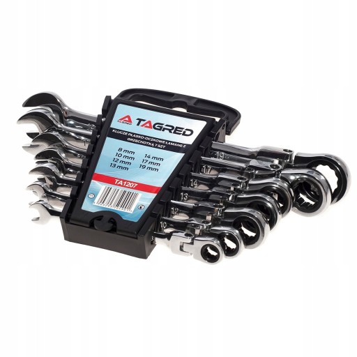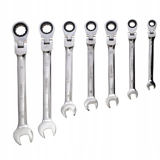 Klucze płasko oczkowe łamane z grzechotką 8-19mm, 7-el. w stojaku