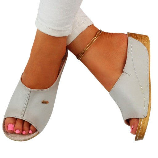Damskie klapki w kolorze szarym na niskim koturnie z ozdobnym szwem na podbiciu. Idealnie sprawdzą się jako obuwie codzienne. Z łatwością dopasują się również do eleganckich stylizacji. Profilowana, skórzana wkładka. Szyta podeszwa skutkuje dłuższą wytrzymałością obuwia.