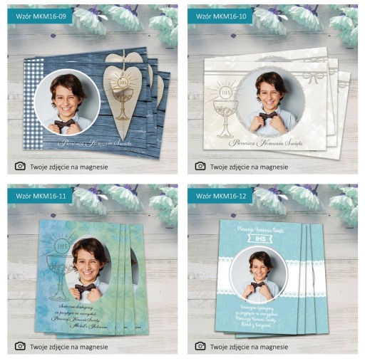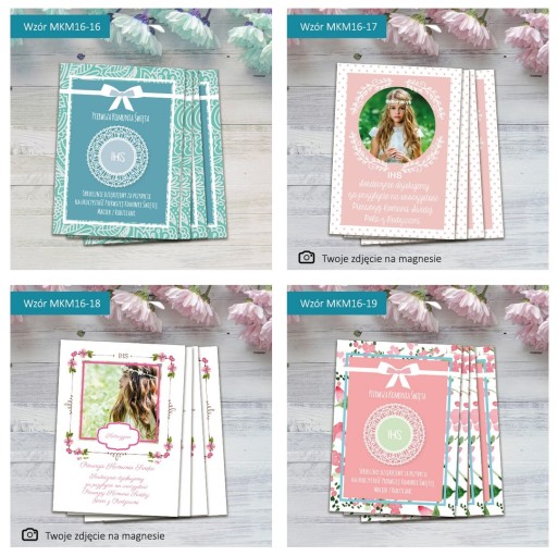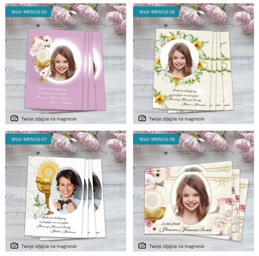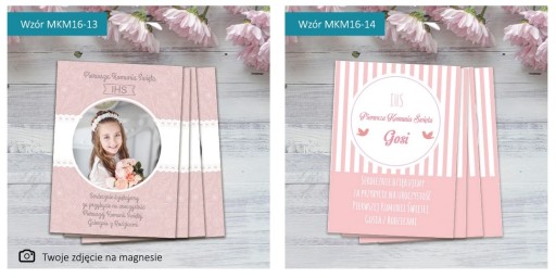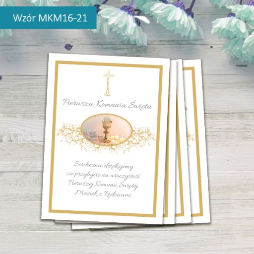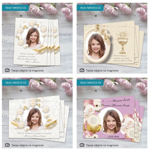 Doskonałym pomysłem na podziękowania dla gości komunijnych są magnesy, które zachwycą stylowym połączeniem złotych kolorów i kwiatów – możemy umieścić na nich zdjęcie dziecka, a także krótki tekst w formie podziękowań. Magnes ma wymiary 7 x 10 cm i wykonany jest z wysokiej jakości materiałów. Możliwość spersonalizowania treści i dodania zdjęcia sprawi, że podziękowanie będzie naprawdę wyjątkowe.