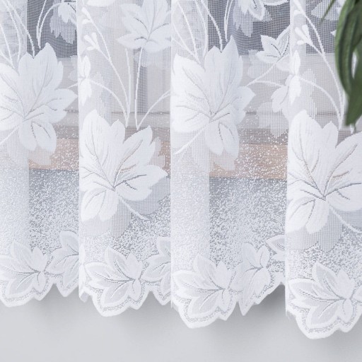 Gotowa do zawieszenia firanka żakardowa z taśmą i dekoracyjnym liściastym wzorem. Wykonana z najwyższej jakości przędzy żakardowej, idealnie wkomponuje się w aranżacje wnętrz nowoczesnych oraz tych urządzonych w klasycznym stylu.