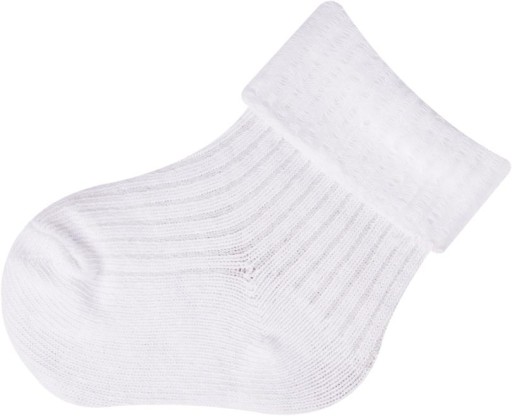 W uniwersalnym białym kolorze, pasującym do wielu stylizacji i do wielu okazji. Bez uciskowe, nie mają typowego ściągacza, dzięki temu są bardzo wygodne dla nóżki dziecka. Posiadają przyjemną, prążkowaną fakturę oraz ozdobne wywinięcie skarpety na zewnątrz.