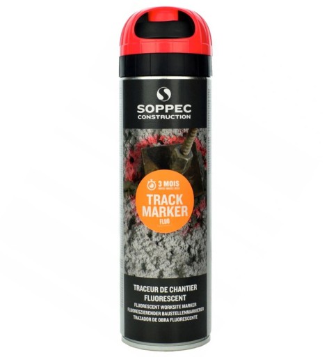 Track Marker firmy Soppec to farba fluorescencyjna w aerozolu przeznaczona do wykonywania oznaczeń na placach budowy oraz do znakowania przy pracach geodezyjnych i pomiarowych. Z jej pomocą wykonamy widoczne, odblaskowe oznaczenia, podkreślając niebezpieczne strefy, zaznaczając pole pod wykop lub znacząc dokonane pomiary. Dzięki farbie Track Marker niewielkim kosztem, znacznie zwiększymy bezpieczeństwo na budowie i usprawnimy pracę. Aerozol stosowany jest w sytuacjach gdy długotrwałe oznaczenia nie są pożądane, utrzymując się na znaczonym obszarze do 3 miesięcy.