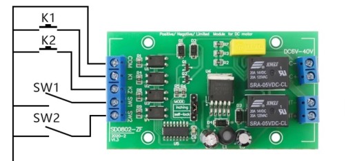 Urządzenie umożliwia zmianę kierunku obrotów silnika DC wraz z obsługą wyłączników krańcowych.