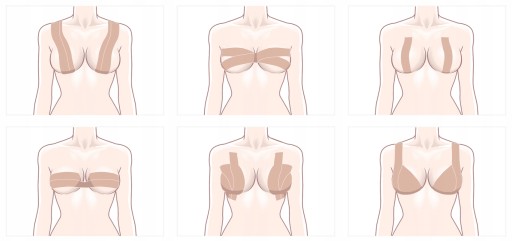 - Zacznij od centralnej części piersi, taśmę naklejaj równolegle z takim samym naprężeniem aby piersi wyglądały naturalnie.