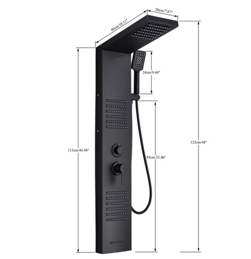 Produkt wykonano z zastosowaniem najwyższej klasy stali nierdzewnej, mosiądzu oraz najwyższej jakości tworzyw sztucznych ABS Panel z deszczownicą i hydromasażem zawiera wszystkie niezbędne elementy do montażu w Waszej łazience, pokoju kąpielowym czy prywatnym SPA.
