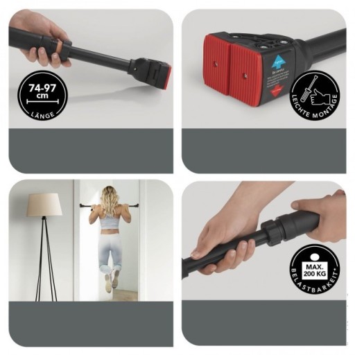 Drążek do podciągania montuje się szybko na framudze drzwi bez wiercenia. Dzięki wygodnej piankowej powłoce zapewnia nie tylko pewne trzymanie bez poślizgu, ale także większy komfort podczas treningu. W zależności od pozycji uchwytu można zmieniać ćwiczenia lub poziom trudności. Oprócz klasycznych podciągnięć w różnych wariantach.