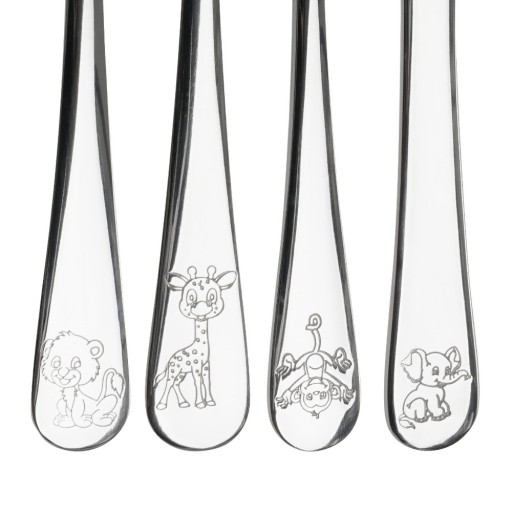 Dzięki odpowiednim do wieku rozmiarom (ok. 17,5 - 12,2 x 3 -1,9 cm) oraz ergonomicznemu kształtowi sztućce idealnie dopasowują się do rączek małych dzieci.Urocze motywy zwierzęce na sztućcach ze stali nierdzewnej wywołują uśmiech na dziecięcych twarzach.