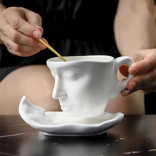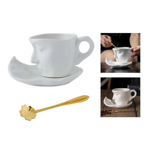 Kubki z ludzką twarzą: Znakomity design, z łyżeczką w kształcie kwiatu i podstawką z ludzką twarzą, piękną i delikatną, wniesie artystyczny motyw do twojego stołu.