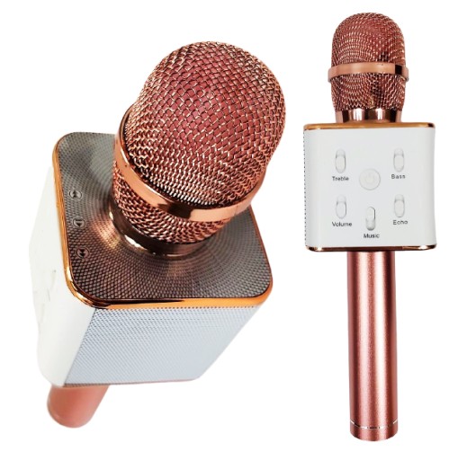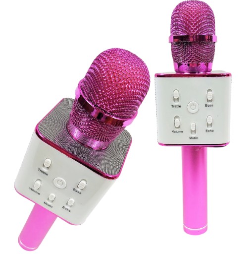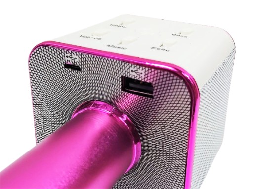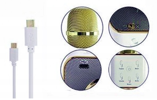 - Mikrofon z dwoma głośnikami . Umożliwia odsłuchiwanie oraz nagrywanie piosenek . podczas śpiewania mikrofon umożliwia regulację siły głosu, podkładu muzycznego, siły basów, sopranów