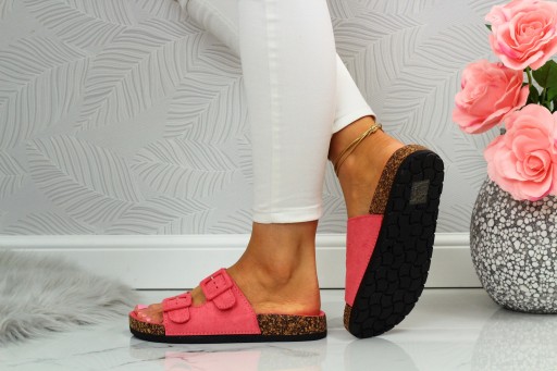 Damskie klapki zapinane na dwie klamry w kolorze fuksji. Sprawdzą się idealnie jako obuwie na co dzień. Będą odpowiednie na ciepłe, wiosenne i letnie, upalne dni. Pasują do wielu stylizacji. Płaska, korkowa podeszwa oraz profilowana wkładka zapewniają komfort i wygodę użytkowania. Wykończone zamszowym materiałem.