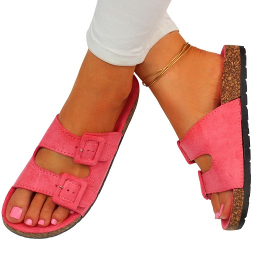 Damskie klapki zapinane na dwie klamry w kolorze fuksji. Sprawdzą się idealnie jako obuwie na co dzień. Będą odpowiednie na ciepłe, wiosenne i letnie, upalne dni. Pasują do wielu stylizacji. Płaska, korkowa podeszwa oraz profilowana wkładka zapewniają komfort i wygodę użytkowania. Wykończone zamszowym materiałem.