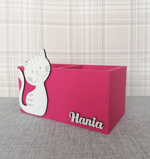 Przybornik został przez nas pomalowany na kolor w odcieniu fuksji a jego dodatkową ozdobą jest namalowany przez naszych plastyków dekor oraz imię dziecka, które należy podać przy składaniu zamówienia.