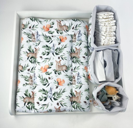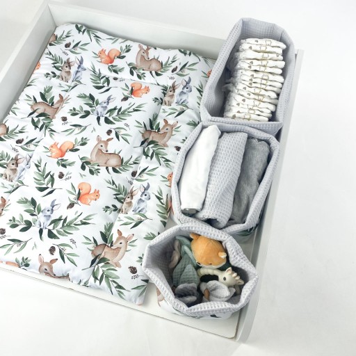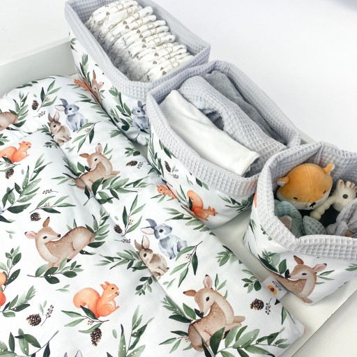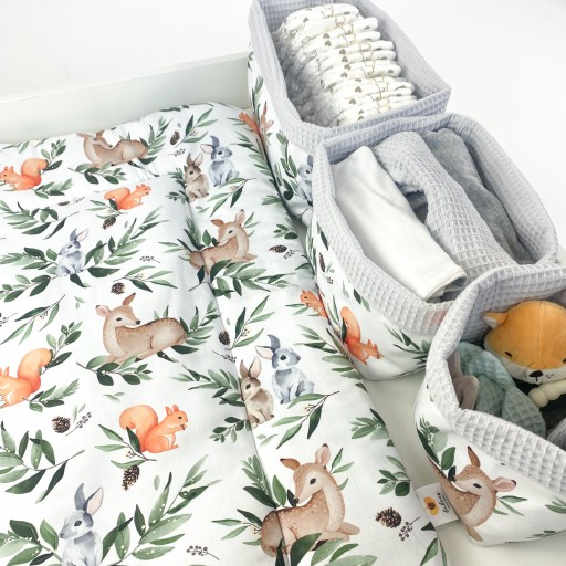 Koszyczki szyte są ręcznie w Polsce. Wykonane są z certyfikowanej bawełny satynowej z kolekcji Charming Forest oraz bawełnianego wafla w kolorze szarym. Boki i spód organizerów wzmocnione są specjalnym usztywnieniem, dzięki czemu zawsze zachowują pożądany kształt. Organizery można prać i prasować w 30 stopniach (należy jednak unikać suszenia w suszarce bębnowej).