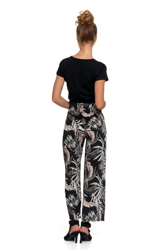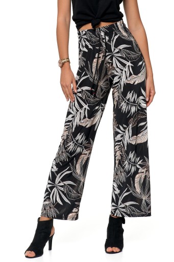 Spodnie damskie alladynki. Model ma luźny nieopinający krój, zapewniający maksimum swobody. Zwiewny delikatny materiał idealnie sprawdzi się w sezonie wiosenno-letnim. W pasie jest szeroki, elastyczny ściągacz – nie uciska i maskuje ewentualne mankamenty sylwetki. Spodnie w całości zdobione są przykuwającym uwagę, modnym wzorem. Tego typu luźne kroje spodni znakomicie komponują się z dopasowaną górą stylizacji.