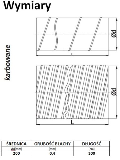 Rury o średnicy powyżej 200 mm wykonywane są z dodatkowym karbem zwiększającym wytrzymałość na podciśnienie. Kanał wykonany z blachy ocynkowanej jest odporny na korozję i warunki atmosferyczne. Oferta dotyczy rury spiro o długości 3 mb. Dostępne są również rury o długościach od 1m do 3m. Istnieje możliwość wykonania wymiaru na zamówienie.